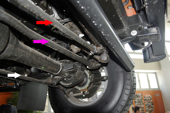 ????前軸特寫二,玫紅色箭頭為橫向推力桿,紅色為轉(zhuǎn)向拉桿,白色的拉桿連接左右的羊角,紅色的轉(zhuǎn)向拉桿帶動(dòng)衛(wèi)士的右前輪轉(zhuǎn)向,通過白色的拉桿聯(lián)動(dòng)左前輪,使左右前輪同步的進(jìn)行轉(zhuǎn)向。