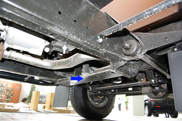 ????后軸特寫圖二,藍(lán)色箭頭所指為拖臂,紅色箭頭所指為后防傾桿,對(duì)于衛(wèi)士的車重而已,其粗細(xì)不能提供很好的仿側(cè)傾效果。后軸依然采用螺旋彈簧作為彈性元件。