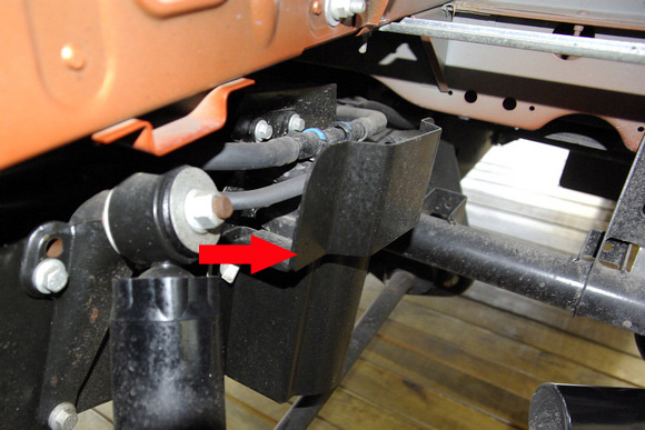 ????細(xì)節(jié)處,剎車的油管外側(cè)有護(hù)板(箭頭處)進(jìn)行周全保護(hù),有效杜絕越野時(shí)由車輪攪入的尖銳物體劃傷油管。
