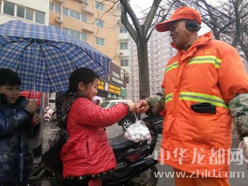 2月27日下午3點,兩個小學生模樣的小朋友冒雨出現(xiàn)在鄭州市三全路與豐慶路口,他們正是“羊肉哥”孫合理的一雙兒女。女兒名叫孫夢露,8歲,兒子名叫孫浩,6歲。他們手里提著元宵,一路給轄區(qū)環(huán)衛(wèi)工人發(fā)放。