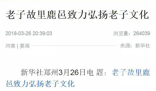 中華龍都網(wǎng)訊(周口報業(yè)全媒體記者 李瑞才 文/圖)再過幾天(本周六),就是老子誕辰2589周年了。為進一步推動老子文化與縣域建設(shè)深度融合,把老子文化這張牌打響擦亮,2016年年初鹿邑縣恢復(fù)舉辦了“老子生日拜典暨河南省非物質(zhì)文化遺產(chǎn)展演系列活動”這一文化盛事,使得老子故里的文化感染力和影響力不斷增強。今年3月31日至4月30日(農(nóng)歷二月十五日至三月十五日),鹿邑將繼續(xù)在縣城和太清宮景區(qū)舉辦2018年老子文化系列活動。連日來,新華社、人民網(wǎng)、光明網(wǎng)等中央主流媒體再次聚焦鹿邑,紛紛為老子故里這一文化旅游產(chǎn)業(yè)發(fā)展盛事宣傳造勢……