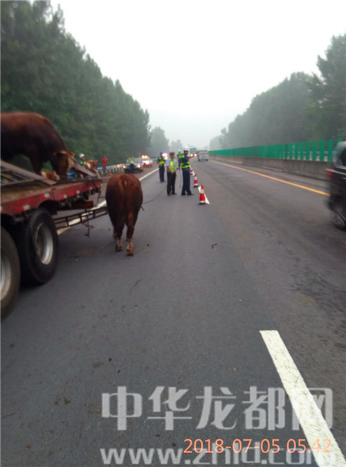 中華龍都網(wǎng)訊(周口報(bào)業(yè)全媒體記者 姬慧洋 通訊員 劉杰 文/圖)“在大廣高速2025公里西半幅附近發(fā)生一起單方事故,幾十頭牛散落在路面,請(qǐng)求處警。”7月5日5時(shí)許,周口市公安局交通管理支隊(duì)高速二大隊(duì)扶溝中隊(duì)接到110指令稱。