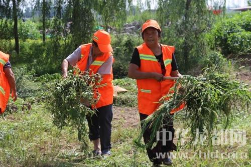 “蒿草長得比人都高,拔都拔不掉,鐮刀都割斷了好幾把了,只能徒手拔。”附近村民姜翠英對記者說,她和同伴們從早上5點多就開始在這兒除草了,雖然又熱又累,但能為城市美化做點貢獻也很高興。