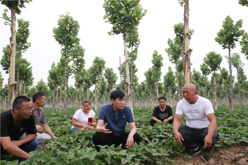 與前廟相鄰的大張村,是一個(gè)“天然大氧吧”。從大張村走出來的曹紅星在鄭州從事園林綠化多年,在朱口鎮(zhèn)黨委、鎮(zhèn)政府的支持和鼓勵(lì)下,他以1000元/畝的價(jià)格流轉(zhuǎn)了1000多畝土地,種植法桐、欒樹、國槐等綠化樹。有著豐富經(jīng)驗(yàn)的曹紅星在種植綠化樹的同時(shí),積極發(fā)展林下經(jīng)濟(jì),在綠化樹下種植紅薯、大蒜等,有效提高了土地的利用率,經(jīng)濟(jì)效益顯著提高?!捌綍r(shí),綠化林地除草、抗旱、施肥需要用工,收種紅薯、大蒜等也需要用工,用工時(shí)貧困戶優(yōu)先。只要有勞動(dòng)能力,來這里就能掙錢。”曹紅星說,林業(yè)經(jīng)濟(jì)的快速發(fā)展為鄉(xiāng)親們脫貧致富提供了保障。