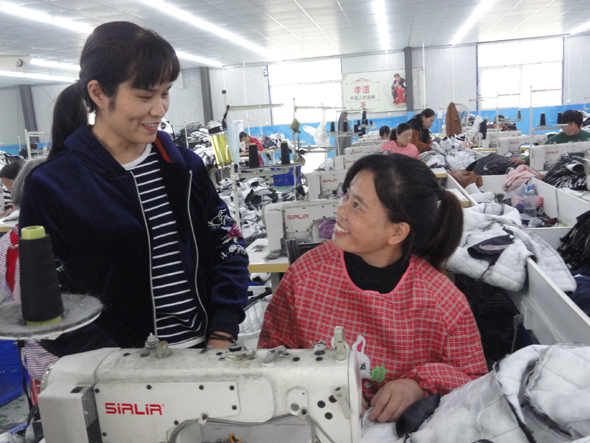 10月20日,商水縣黃寨鎮(zhèn)草樓村“返鄉(xiāng)創(chuàng)業(yè)標(biāo)兵”、鎮(zhèn)人大代表梁艷麗(左)向留守婦女李霞了解生產(chǎn)情況。5年前,梁艷麗和丈夫田新田從溫州打工返鄉(xiāng)后在鎮(zhèn)人大、工商聯(lián)和扶貧辦的幫助下投資200萬(wàn)元?jiǎng)?chuàng)建巧姑制衣有限公司,下設(shè)3個(gè)制衣廠和1個(gè)扶貧車間,安排當(dāng)?shù)?00多名留守婦女和30名貧困戶婦女就業(yè)。
