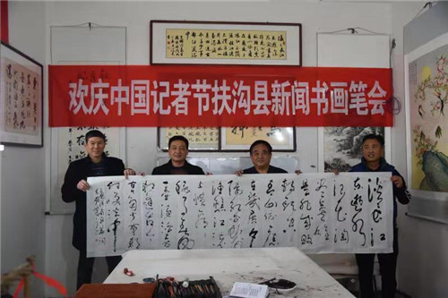 筆墨寫春秋,重彩頌佳節(jié)。為慶祝第19個(gè)中國(guó)記者節(jié),在扶溝縣的張坡詩(shī)詞名人書畫館,來(lái)自省書法家協(xié)會(huì)的書法家與當(dāng)?shù)匦侣勑麄鞑块T的書畫愛好者們齊聚一堂,以舉行書畫筆會(huì)的形式向新聞媒體人慶賀節(jié)日。