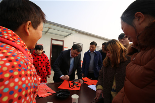 李宗喜一邊寫春聯(lián),一邊詢問居民生活情況。冬天住這兒冷不冷?超市里的東西貴不貴?住在這里安全不安全?他問得很細(xì)。劉愛菊、朱桂英、王芬、李會等住戶,你一言我一語,紛紛說出自己的感受:“冬天有空調(diào),不冷!”“超市里的東西跟外面一樣便宜!”“小區(qū)有監(jiān)控和保安,住在這里很安全。”有的甚至幽默地說:“我在這里都住習(xí)慣了,感覺挺好,以后就不搬走了!”聽到這話,眾人都笑了起來。