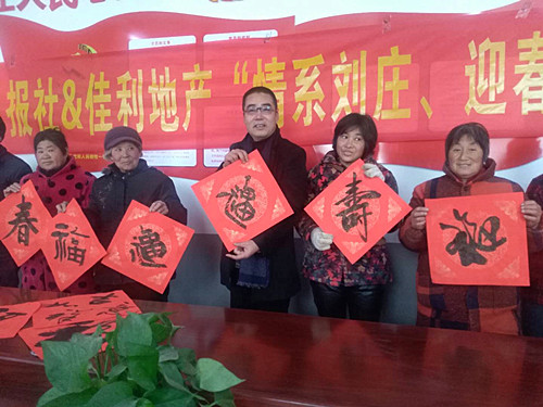 1月25日,周口報(bào)業(yè)傳媒集團(tuán)偕愛(ài)心企業(yè)佳利偉業(yè)、周口農(nóng)商銀行,邀請(qǐng)周口藉中國(guó)書(shū)協(xié)會(huì)員靳玉峰、曾祥峰等,來(lái)到淮陽(yáng)馮塘劉莊村,為群眾義寫、贈(zèng)送春聯(lián)500多套,村委大院一片歡騰,喜氣洋洋。