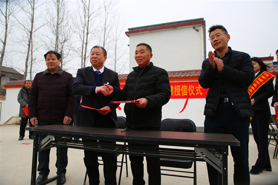 崗趙村是周口市行政服務(wù)中心幫扶的貧困村。去年11月份,駐村第一書(shū)記李文杰得知西華廈農(nóng)商村鎮(zhèn)銀行已開(kāi)始在村一級(jí)評(píng)定設(shè)立“鄉(xiāng)村振興示范點(diǎn)”,立即與該行負(fù)責(zé)人取得聯(lián)系、積極溝通。銀行方面經(jīng)過(guò)認(rèn)真考察,最終確定在崗趙“設(shè)點(diǎn)”。25日在崗趙村部舉行的授牌授信儀式上,西華縣人民銀行有關(guān)負(fù)責(zé)人為崗趙村授予“鄉(xiāng)村振興示范點(diǎn)”牌匾,西華廈農(nóng)商村鎮(zhèn)銀行負(fù)責(zé)人與崗趙村負(fù)責(zé)人簽訂了授信協(xié)議書(shū)。周口市行政服務(wù)中心和葉埠口鄉(xiāng)政府負(fù)責(zé)人都熱情致辭,百余名村民代表見(jiàn)證了這一激動(dòng)人心的時(shí)刻。準(zhǔn)備做早餐生意的村民趙合成說(shuō):“咱農(nóng)民貸款也不用再跑冤枉路、花冤枉錢(qián),這個(gè)‘點(diǎn)’設(shè)得真中!”