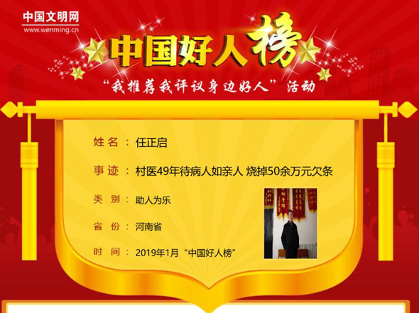 太康縣馬頭鎮(zhèn)任莊村村醫(yī)任正啟,待病人如親人,用腳步丈量任莊村周邊的每寸土地,他49年燒掉50余萬元貧困戶看病欠條。2月25日,中國文明網(wǎng)發(fā)布消息:任正啟榮登2019年1月“助人為樂類”“中國好人榜”。