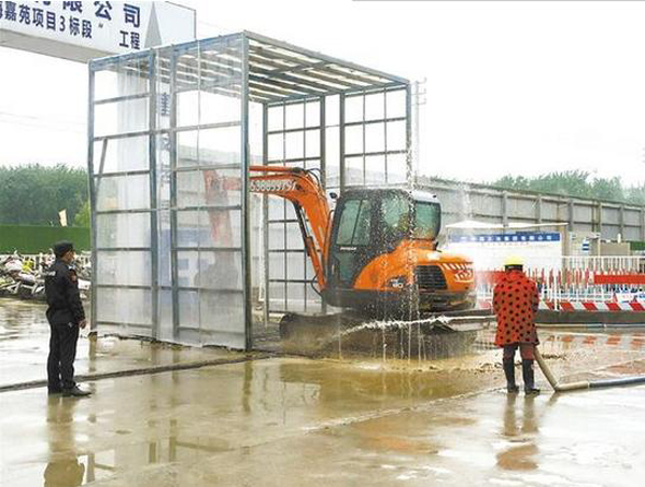 4月27日上午,川匯區(qū)一工地大門口,準備駛出工地的工程車正接受清洗。工作人員說,每輛工程車都有規(guī)定的清洗時間,一般是兩分多鐘,保證從工地出去的車輛干干凈凈。記者 王凱 攝