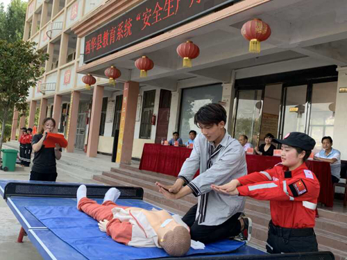 活動現(xiàn)場,消防教官為同學們講解了防火安全的重要性,火災的預防和救助,演示了滅火器的使用方法;西華縣紅十字會救護師耿佳佳、姚華杰二人為同學們現(xiàn)場生動講解演示“珍愛生命、預防溺水”的生動安全教育課,讓同學了解溺水的危害性,做好有效預防溺水的重要性,演示發(fā)生溺水怎么辦及對溺水者如何做胸外心臟按壓,同學們認真聆聽和學習,學會了判斷呼吸心跳停止、按壓手法、按壓位置、打開氣道方法、判斷呼吸心跳是否恢復等急救技能。同學還掌握了溺水急救基本標準:打開氣道、人工呼吸、胸外按壓。