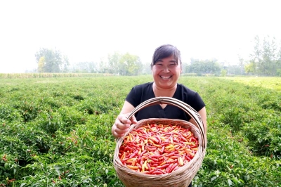 在朱樓行政村,朱高杰、王麗夫妻倆正帶領(lǐng)20多名采摘工人在辣椒田里采摘艷紅、泡椒兩個品種,地頭停放著盛滿辣椒的三輪車和五六個蛇皮袋,火紅的辣椒映襯著小兩口臉上燦爛的笑容:“大豐收呀,這塊地是泡椒,還沒有出地頭,就劃3.8元一斤了,走向市場至少五六元錢。咱吃的泡椒鳳爪、泡椒罐頭,都是這做的。像那塊地的艷紅,就像它的名字一樣又紅又鮮艷,出地頭就得七八塊,賣到市場上都10多元一斤,主要賣到四川、湖北等地,這是火鍋底料、炒菜的必備品,這是個炒出來有香味的辣椒品種?!蓖觖惸苷f會道,而且在她的帶動下,全鄉(xiāng)許多親朋好友都在種植辣椒。像王麗一樣,汲水鄉(xiāng)種植辣椒面積突破了1萬畝,整個鄲城縣種植辣椒突破5萬畝。
