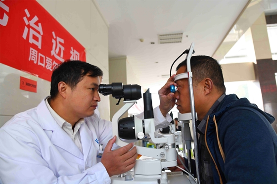 11月8日是記者節(jié)。為了讓奔波在新聞戰(zhàn)線,熬夜趕稿、組版的編輯記者眼睛更健康,11月5日,周口愛爾眼科醫(yī)院的醫(yī)生將儀器搬到周口報業(yè)傳媒集團,現(xiàn)場為編輯記者檢查眼睛,關愛新聞工作者的身心健康。圖為眼科醫(yī)生為記者檢查視力、實施治療。記者 劉俊濤 梁照曾 攝