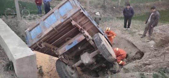 接警后,鄲城消防大隊(duì)立即出動(dòng)3輛消防車(chē)15名指戰(zhàn)員前往處置。經(jīng)偵查發(fā)現(xiàn),側(cè)翻車(chē)輛是一輛農(nóng)用三輪車(chē),車(chē)上拉有約2噸散裝玉米?,F(xiàn)場(chǎng)玉米灑落一地,駕駛員約六十歲,左腿被農(nóng)用三輪車(chē)前輪壓住,無(wú)法脫身,加之即將天黑,當(dāng)時(shí)天氣較冷,如不及時(shí)處置,后果不堪設(shè)想。
