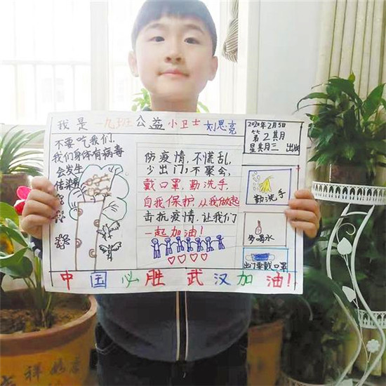 周口六一路小學(xué)近日布置了一項(xiàng)作業(yè),要求學(xué)生設(shè)計(jì)一張防疫宣傳小報(bào),為武漢加油。該校學(xué)生用漫畫的形式呼吁大家勤洗手、戴口罩、多喝水、多通風(fēng)。記者 王晨 通訊員 李琨 攝