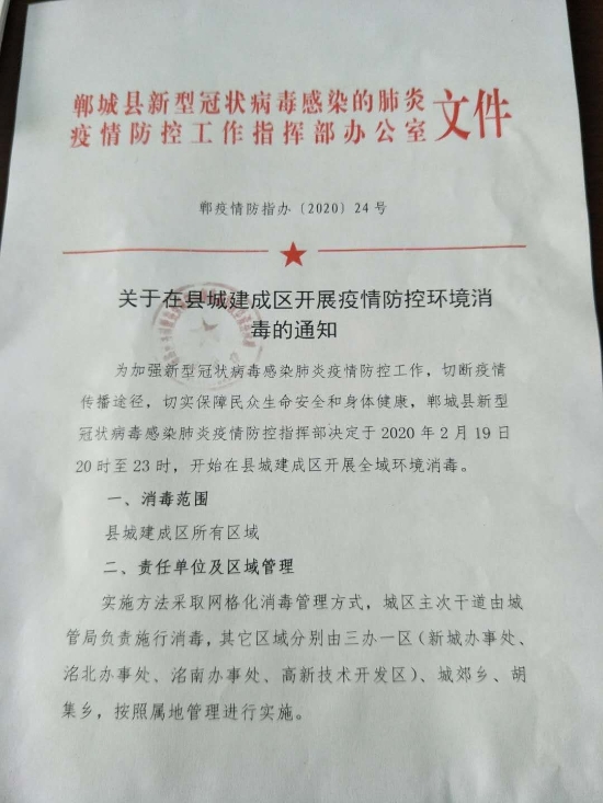2月19日,記者從鄲城縣新冠肺炎疫情防控指揮部了解到,《鄲疫情防指辦〔2020〕24號》指出,為加強新型冠狀病毒感染肺炎疫情防控工作,切斷疫情傳播途徑,切實保障民眾生命安全和身體健康,鄲城縣新型冠狀病毒感染肺炎疫情防控指揮部決定于2020年2月19日20時至23時,開始在縣城建成區(qū)開展全域環(huán)境消毒。
