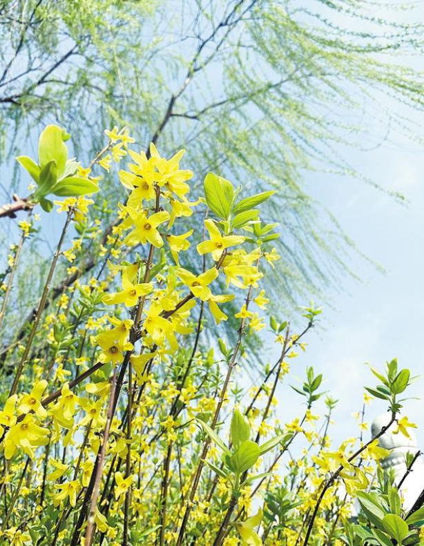 作為春天的信使,一叢叢嬌黃的連翹花,為大地帶來(lái)了濃濃春意?;ǘ湓诖猴L(fēng)的吹拂下?lián)u曳,團(tuán)團(tuán)簇簇,涌動(dòng)如金色波浪。走近之時(shí),聞花香淡雅、賞滿(mǎn)枝金黃,人們也以“報(bào)春花”來(lái)稱(chēng)呼它。