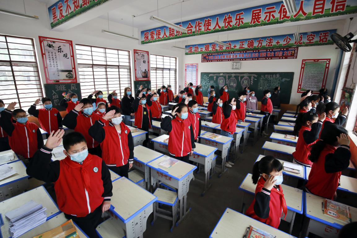 這是一次特殊的升國旗儀式,三名國旗手在操場上將五星紅旗冉冉升起,升旗實況同步轉(zhuǎn)播到教室內(nèi)的電視屏幕上,同學們在各自教室里面向國旗莊嚴肅立、齊唱國歌,面向國旗敬禮,在國旗下立下一個志,將來成為一個對社會有貢獻的人,能夠為社會做出突出成績的人。