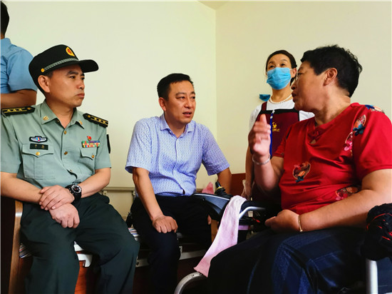 走進位于太昊路上的周口市老年護理院,院內(nèi)整潔有序、花蕊吐香鳥鳴聲聲,小徑通幽處的涼亭內(nèi)三五老人打牌、聊天,一副愜意安詳?shù)纳顖鼍?。在侯國領(lǐng)母親王玉勤居住的房間內(nèi),李揚、孫光濤等人坐在床邊與她聊天談心,看到這么多人來慰問她,王玉勤眼中流下了感動的眼淚,她對慰問人員表示感謝,說自己來護理院近一年來,吃住條件都不錯,護理院照顧的無微不至,身體一天天恢復(fù),閑暇時還能不依賴輪椅自己走上一段路。她激動地說:“感謝黨和政府的親切關(guān)懷,我最大的愿望是希望倆兒子永遠(yuǎn)聽黨的話,在部隊安心服役、再立新功,用優(yōu)異的成績回報黨和政府對我們?nèi)业年P(guān)愛?!?/p>