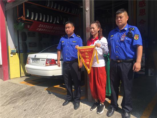 夏日的陽光透過清澈的天空照下來,街很凈,樹很綠。8月18日是開發(fā)區(qū)城管稽查大隊進行“門前三包”流動紅旗和流動黑旗評選的日子。開發(fā)區(qū)城管稽查大隊工作人員根據(jù)綜合評比標準,分別為“門前三包”工作突出的門店懸掛流動紅旗,為“門前三包”工作不力的門店懸掛黑旗。