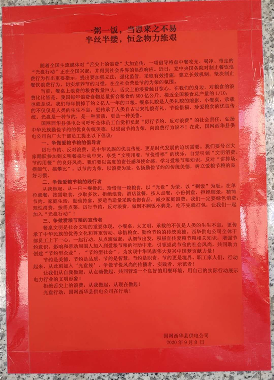 “節(jié)約糧食必須從我們自己做起,從身邊的人做起,更要從小事做起”。該公司職工紛紛表示,勤儉不是吃苦,“光盤”是節(jié)約,是習(xí)慣,是一種品質(zhì),更是對(duì)黨中央號(hào)召反對(duì)浪費(fèi)的響應(yīng),對(duì)國(guó)網(wǎng)“三節(jié)約”精神的認(rèn)真詮釋和體現(xiàn)!