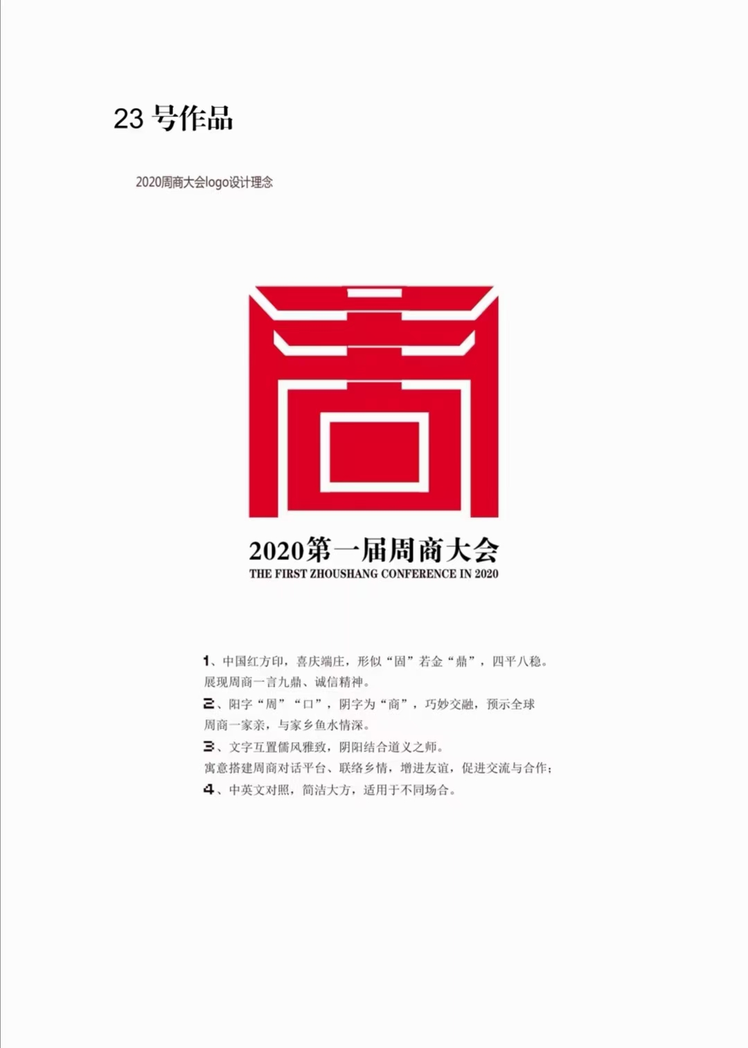 23號作品設(shè)計者沈湛向記者介紹了獲獎作品的設(shè)計理念。作品采用中國紅,喜慶端莊,智圓行方,形似“固”若金“鼎”,四平八穩(wěn),展現(xiàn)了周商的志存高遠(yuǎn)、一言九鼎和誠信經(jīng)營。同時,陽字“周”“口”,陰字為“商”,巧妙交融,預(yù)示全球周商一家親,周商和家鄉(xiāng)魚水情深。再者,文字互置儒風(fēng)雅致,陰陽結(jié)合道義之師,寓意搭建周商對話平臺,聯(lián)絡(luò)鄉(xiāng)情、增進(jìn)友誼,促進(jìn)交流與合作。最后,中英文對照,簡潔大方,適用于不同場合。