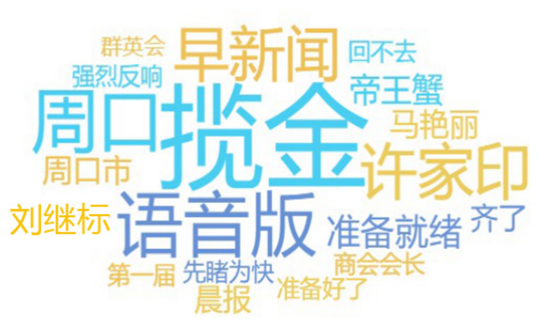 網(wǎng)絡(luò)熱詞反映了網(wǎng)民關(guān)注的重點,詞云圖中大大的“攬金”二字占據(jù)詞云圖中央,可見攬金是真的攬金,據(jù)悉,首屆周商大會簽約項目31個,總投資達(dá)429.7億元人民幣。“許家印”“馬艷麗”在整個圖中也是光彩奪目,作為周口人,走上北上廣深的成功人士還心心念念家鄉(xiāng)的發(fā)展,讓老鄉(xiāng)們倍感溫暖,家鄉(xiāng)人關(guān)注他們?yōu)榧亦l(xiāng)發(fā)展做出的努力和他們的動態(tài)也是再正常不過了。