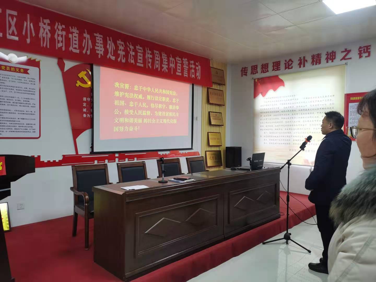 國(guó)歌響起,全體人員起立唱國(guó)歌。隨后,小橋街道辦事處黨工委書(shū)記侯明亮左手撫按憲法,右手舉拳,領(lǐng)誦誓詞,其他宣誓人跟誦誓詞。宣誓后,侯明亮對(duì)開(kāi)展好憲法宣傳周宣傳活動(dòng)、學(xué)習(xí)黨的十九屆五中全會(huì)精神和習(xí)近平總書(shū)記關(guān)于憲法的重要論述做了具體安排部署,要求大家要結(jié)合當(dāng)前工作實(shí)際,做到依憲施政、依法行政,進(jìn)一步提高尊法學(xué)法守法用法意識(shí)。