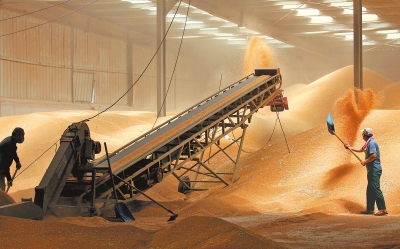 許昌市建安區(qū)陳曹鄉(xiāng)雙廟村金豐公社農(nóng)業(yè)服務有限公司,工作人員在糧倉中整理剛剛?cè)霂斓男←?。資料圖片