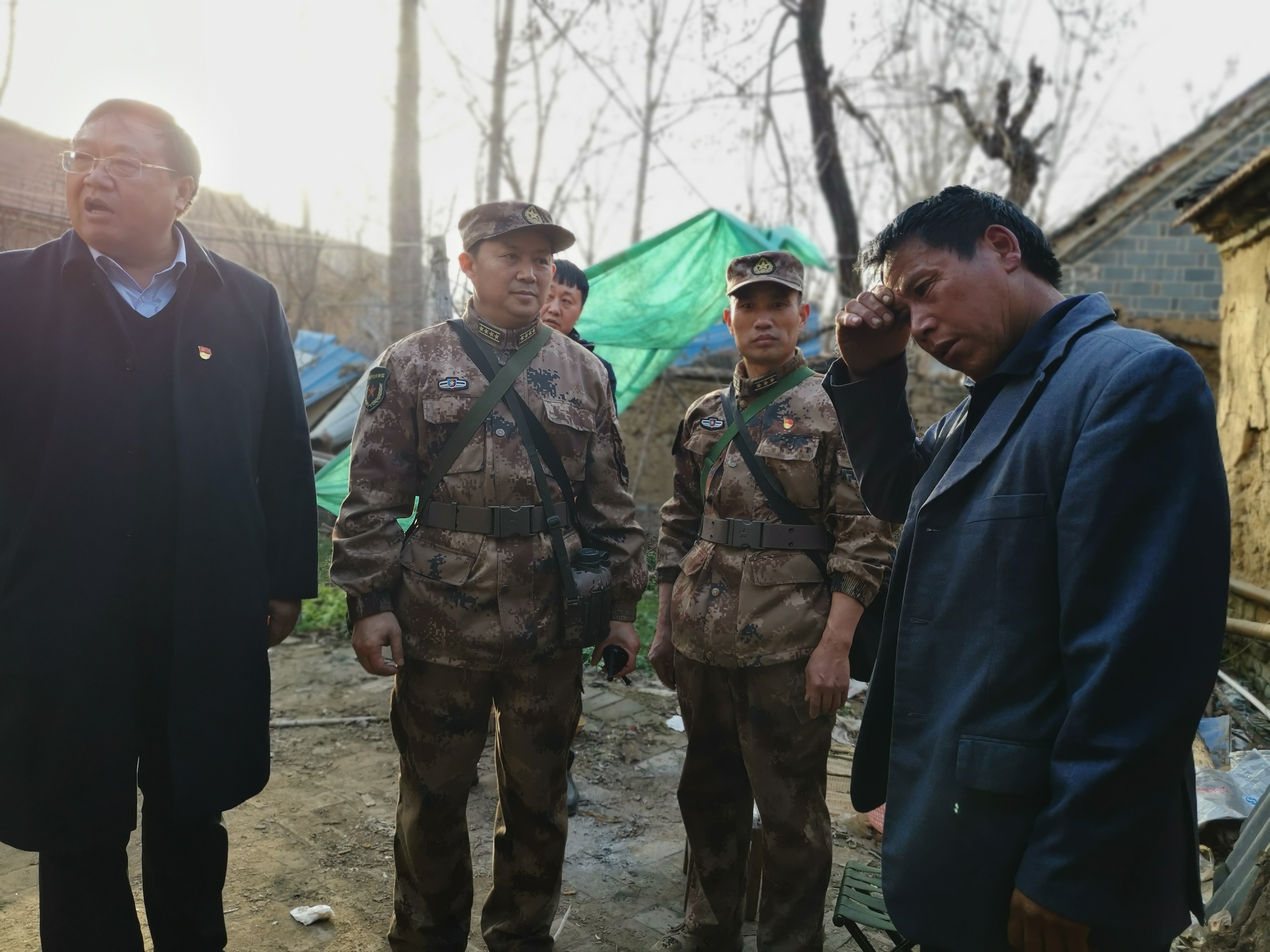 周口軍分區(qū)還將政治工作貫穿于野營拉練全過程,當行至周口港區(qū)苑寨行政村時,薛振喜、周口軍分區(qū)政治工作處主任李揚以及川匯區(qū)人武部部長陳繼芳、政委高新傳等來到貧困戶苑立中家中慰問,為他們送去米面糧油等慰問品。看著簡陋的房屋,得知苑立中獨自一個人拉扯3個孩子的艱辛生活后,薛振喜囑咐當?shù)卣臀溲b部門要想辦法幫扶這戶貧困家庭。 苑立中激動地流下眼淚,握著薛振喜的手連聲感謝。