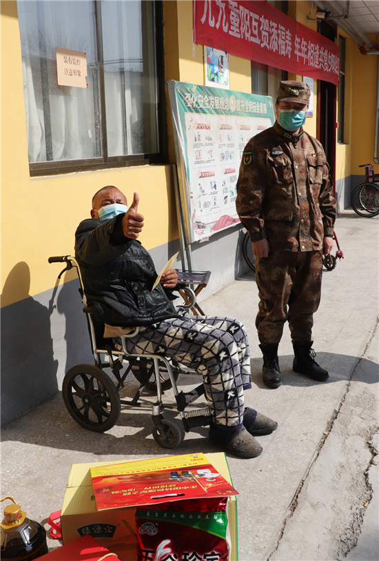新橋鎮(zhèn)新兵楊凱入伍前和癱瘓的父親相依為命,市人武部領(lǐng)導(dǎo)協(xié)調(diào)地方政府,把其父親送到了新橋鎮(zhèn)敬老院公費(fèi)養(yǎng)老,解除他的后顧之憂。春節(jié)到了,人武部領(lǐng)導(dǎo)還牽掛著這個(gè)特困家庭,矯百成帶隊(duì)來到新橋鎮(zhèn)敬老院。此時(shí)正值中午,楊凱的父親正坐在屋外的輪椅上曬太陽,見到矯部長(zhǎng)的突然到來,激動(dòng)的眼含熱淚,他緊緊握住矯百成的手久久不愿松開。矯百成噓寒問暖,給他送上1000元慰問金和生活必需品,楊凱的父親用他那不太清晰的語言表達(dá)對(duì)部長(zhǎng)的真誠(chéng)感謝。在敬老院院長(zhǎng)的帶領(lǐng)下,矯百成又來到老人的住室察看起居情況,詢問他平時(shí)生活狀況,當(dāng)?shù)弥先松畹暮苁娣r(shí),矯百成滿意的笑了。
