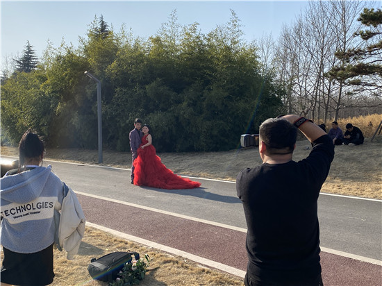 優(yōu)美的景色不是市民享受春光的好去處,也是拍攝婚紗照的好地方。“老婆靠老公近一點(diǎn)、再近一點(diǎn),微笑、嗯不錯?!币粚π氯苏谂幕榧喺?,紅色的婚紗與自然的風(fēng)景融在一起,盡顯新娘的美麗。在植物園里,拍一組森系風(fēng)格的婚紗照很是漂亮,春風(fēng)將“調(diào)色板”打翻,一對新人的甜蜜愛情就這樣被定格在這春天里。
