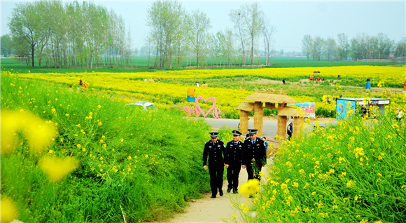 4月10日上午,商水縣公安局組織民警在鄧城鎮(zhèn)6000多畝油菜花海中執(zhí)勤巡邏,疏導交通,確保游客安全。當日,商水縣首屆金色花田樂游匯暨農(nóng)特產(chǎn)品展銷會開幕式在此舉行。來自市內(nèi)外的數(shù)萬名游客到這里踏青賞春。