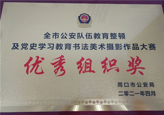 近日,扶溝縣公安局在全市公安隊伍教育整頓及黨史學習教育書法美術(shù)攝影作品大賽中榮獲優(yōu)秀組織獎,同時,該局推薦報送的多部書法攝影作品大賽中也榮獲多個獎項。其中,書法類榮獲一等獎1名、二等獎2名、三等獎1名、優(yōu)秀獎1名;美術(shù)類榮獲二等獎2名、三等獎4名;攝影類榮獲二等獎1名、三等獎1名。