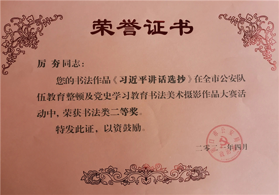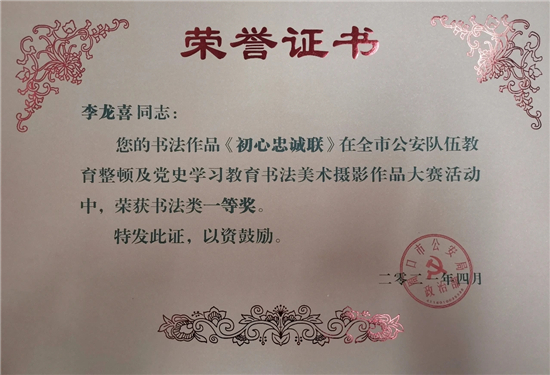 本次大賽,我市民輔警積極參加,踴躍報送,選送書法、美術(shù)、攝影作品30余件。其中扶溝縣公安局宣傳科李龍喜、交警大隊厲夯等人的書法《初心忠誠聯(lián)》《習近平講話選抄》等作品分別榮獲書法類一等獎、二等獎;扶溝縣公安局宣傳科閆曉鳳等人的攝影作品《晨讀》、《走訪話安全》等分別榮獲攝影類二等獎、三等獎。此次大賽,全面筑牢了民輔警忠誠履職的思想根基,切實把教育整頓及黨史學習教育活動的成果轉(zhuǎn)化為思想成果和工作成果。充分展示了扶溝公安堅定的理想信念和良好的精神風貌。②9