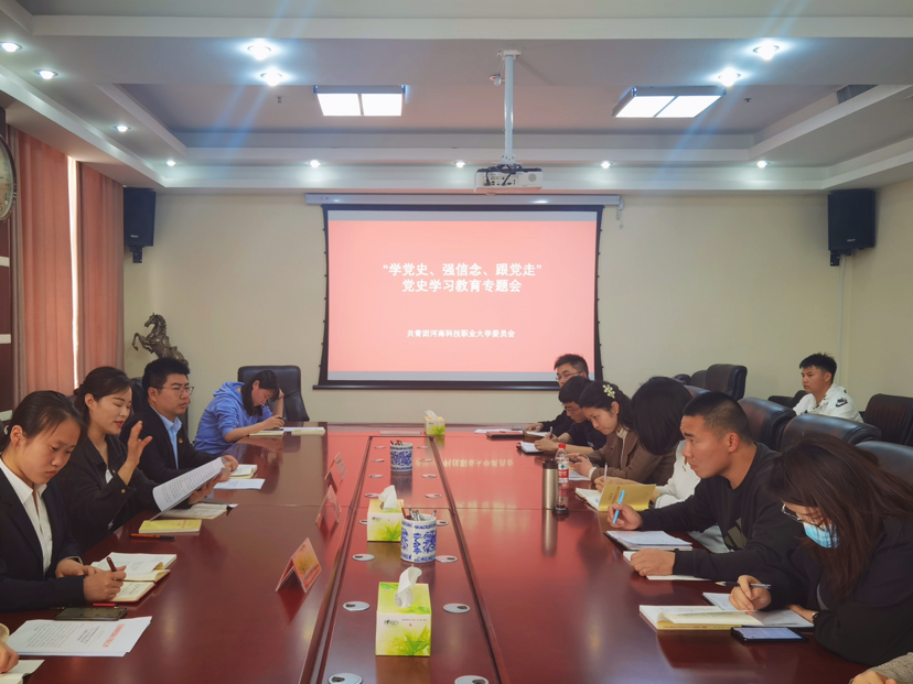 為認真貫徹習(xí)近平總書記在黨史學(xué)習(xí)教育動員大會上的重要講話精神,引領(lǐng)廣大黨員深入學(xué)習(xí)黨的歷史,深化青年厚植愛黨、愛國、愛社會主義的情感,4月29日,共青團河南科技職業(yè)大學(xué)委員會召開“學(xué)黨史、強信念、跟黨走"黨史學(xué)習(xí)教育專題會。