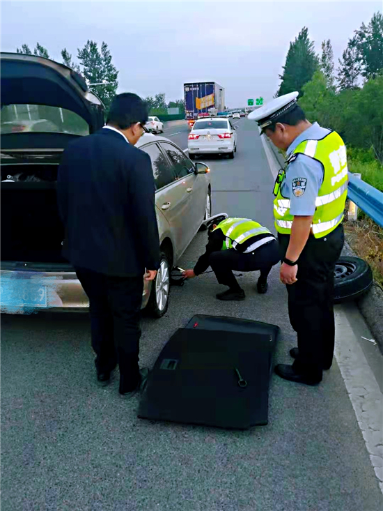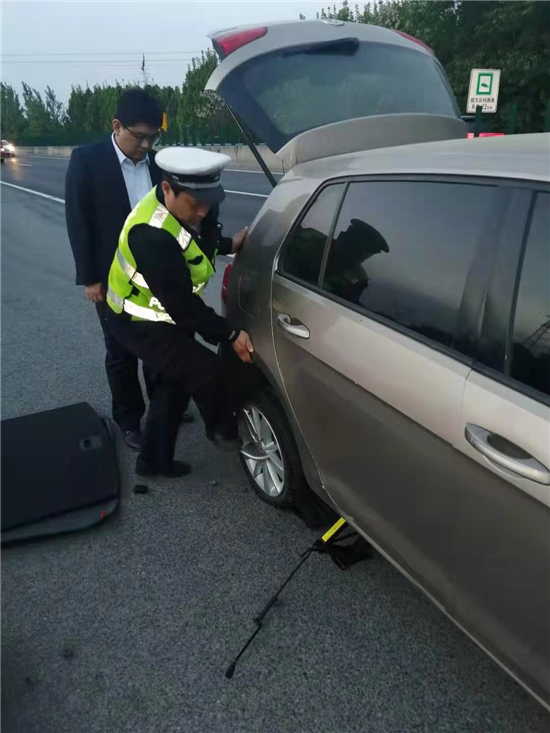 該男子看到民警過來,當(dāng)即求助,說自己在車輛行駛過程中,發(fā)現(xiàn)右側(cè)后輪爆胎,自己沒有處理這種狀況的經(jīng)驗(yàn),不會更換輪胎,車上就他一人,感到非常無助。當(dāng)時,途經(jīng)車輛呼嘯而過,天色逐漸暗了下來,情況十分危險(xiǎn)。看到此種情況,巡邏民警立即動手從車上拿來工具,迅速幫該車主把破損輪胎卸掉,更換上車載備胎,解決了司機(jī)的燃眉之急,并告知其盡快從最近出口離開,更換標(biāo)準(zhǔn)輪胎后才能在高速公路上安全行駛。該司機(jī)再三表示感謝后駕車離去。③6