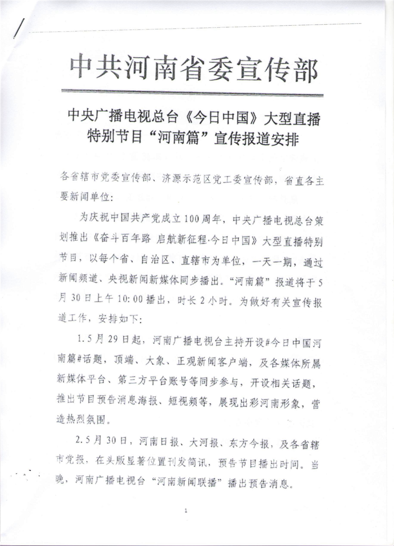 中央廣播電視總臺(tái)《今日中國(guó)》大型直播特別節(jié)目“河南篇”宣傳報(bào)道安排
