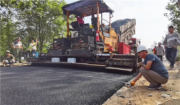 路面鋪油作業(yè)從淮陽(yáng)區(qū)葛店鄉(xiāng)與鄲城縣李樓鄉(xiāng)交界處開(kāi)始,一臺(tái)攤鋪機(jī)鋪設(shè)寬度為7米,壓實(shí)厚度為5厘米,以平均每分鐘5米的速度前行,數(shù)輛運(yùn)料車(chē)輪流供料給攤鋪機(jī)。攤鋪機(jī)過(guò)后,兩臺(tái)壓路機(jī)交替運(yùn)行,立即把路面壓實(shí);兩臺(tái)灑水車(chē)配合作業(yè),路面一次成型,寬闊而平坦。