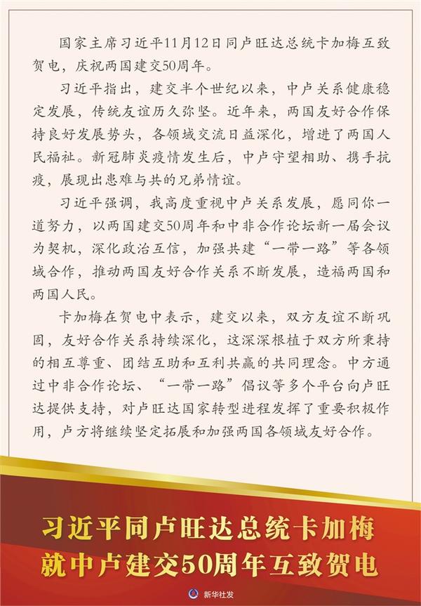 習近平同盧旺達總統(tǒng)卡加梅就中盧建交50周年互致賀電