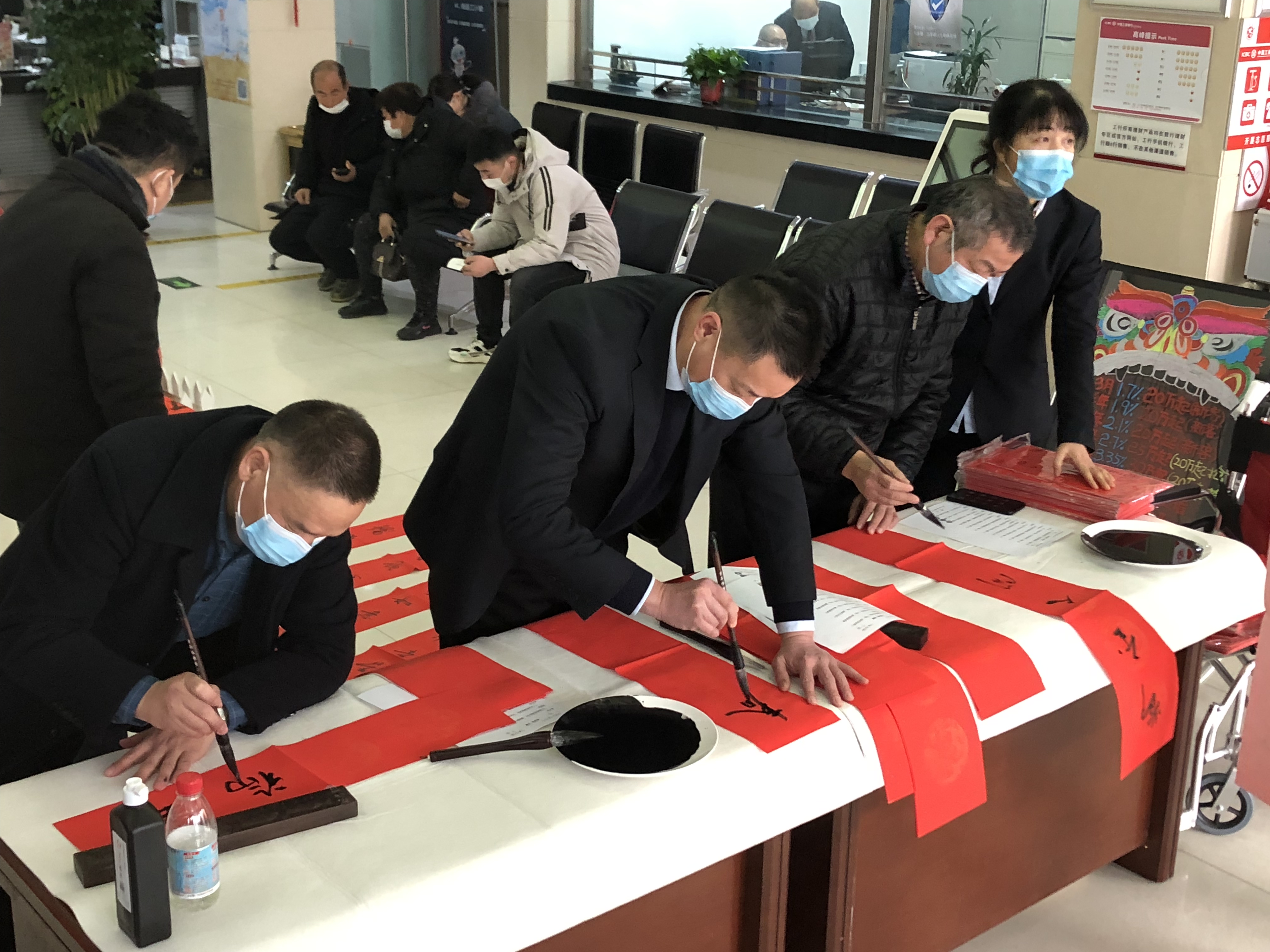 春節(jié)臨近,工行周口分行開展“寫春聯(lián)送福字”活動(dòng),精心組織本行書法協(xié)會會員分赴基層網(wǎng)點(diǎn),在營業(yè)廳堂揮毫潑墨,為客戶寫春聯(lián)、送福字。把一幅幅盛贊祖國昌盛、人民安居樂業(yè)、新春祝福送給客戶。此次活動(dòng),該行共計(jì)為客戶送出春聯(lián)1300余幅,受到廣大客戶的稱贊。 李玉 攝①2