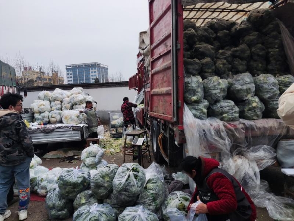 相比于肉類區(qū),蔬菜區(qū)停了很多送貨的小三輪,大多是前來批發(fā)的散戶,大包小包往三輪里裝。據(jù)商販李大姐介紹,臨近春節(jié),天氣寒冷,有一些蔬菜的價格略有上漲,但整體價格并不是很高。她主要是做花菜批發(fā),因為花菜能長期存放,所以價格并不高,只有一塊錢一斤?!皟r格比之前要低一點,但是銷量上升很多,薄利多銷吧?!崩畲蠼阏f。