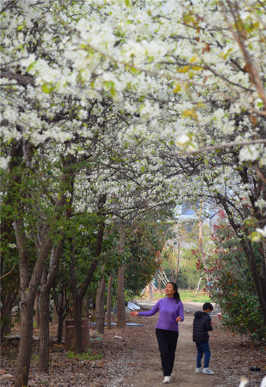 3月26日,周口市天氣晴好,植物園內岸柳青青、鶯飛草長。園內的梨花正是盛開時,不少市民在此駐足觀賞拍照。②8