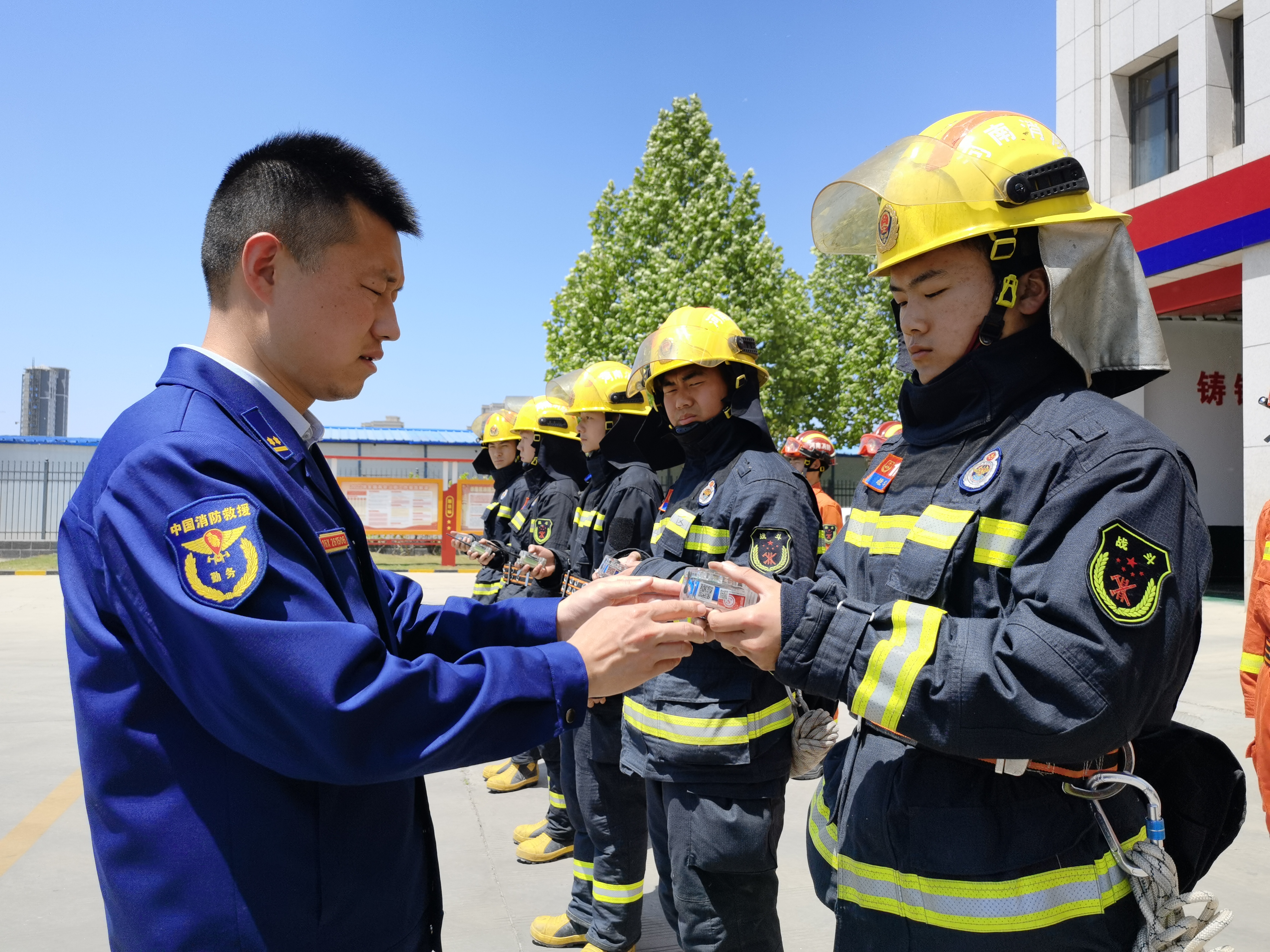 全封閉管理、備戰(zhàn)狀態(tài),檢查裝備、養(yǎng)護車輛,給消防救援人員上課……5月4日,示范區(qū)消防救援站指導員欒慶帥站在烈日下為消防救援隊員講授專業(yè)救援技巧和專業(yè)工具使用方法。