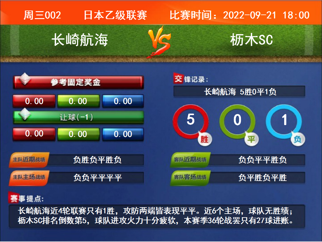 周三002 日本乙級聯(lián)賽 長崎航海VS櫪木SC