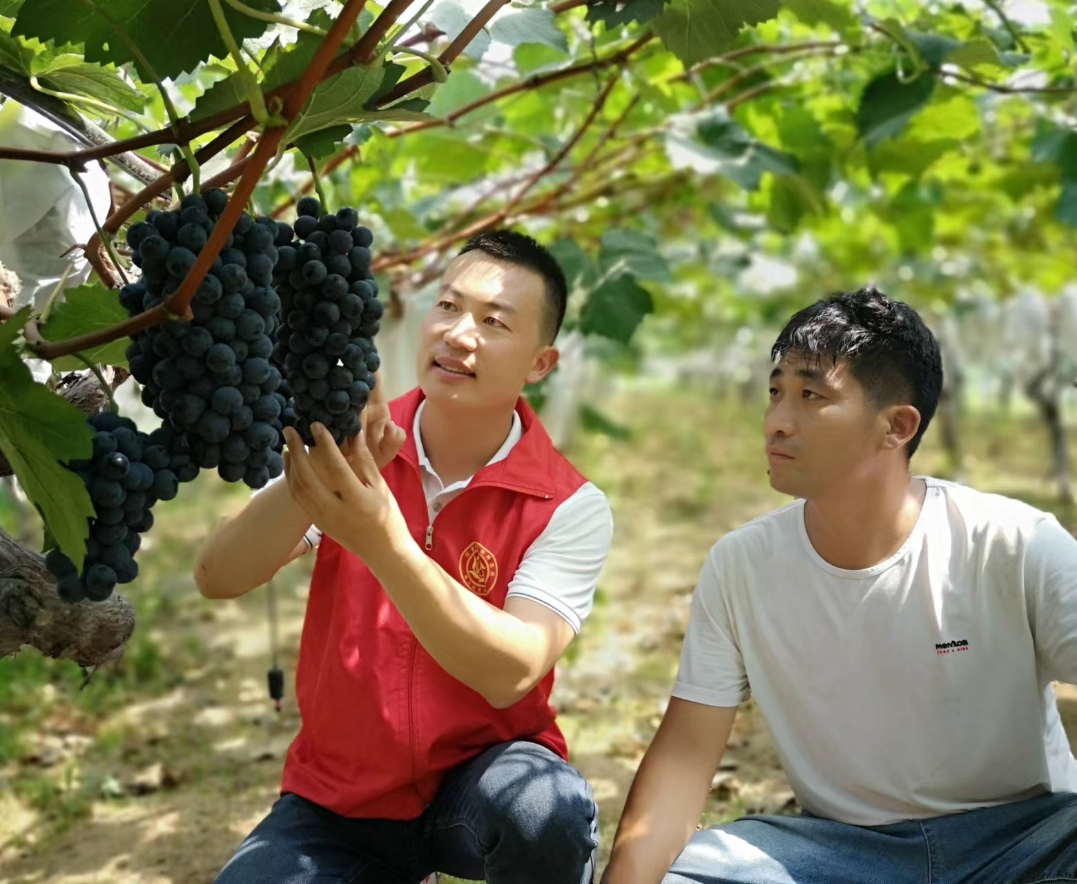 (左一:“河南省最美村官”張耀和村民一起查看葡萄長(zhǎng)勢(shì))