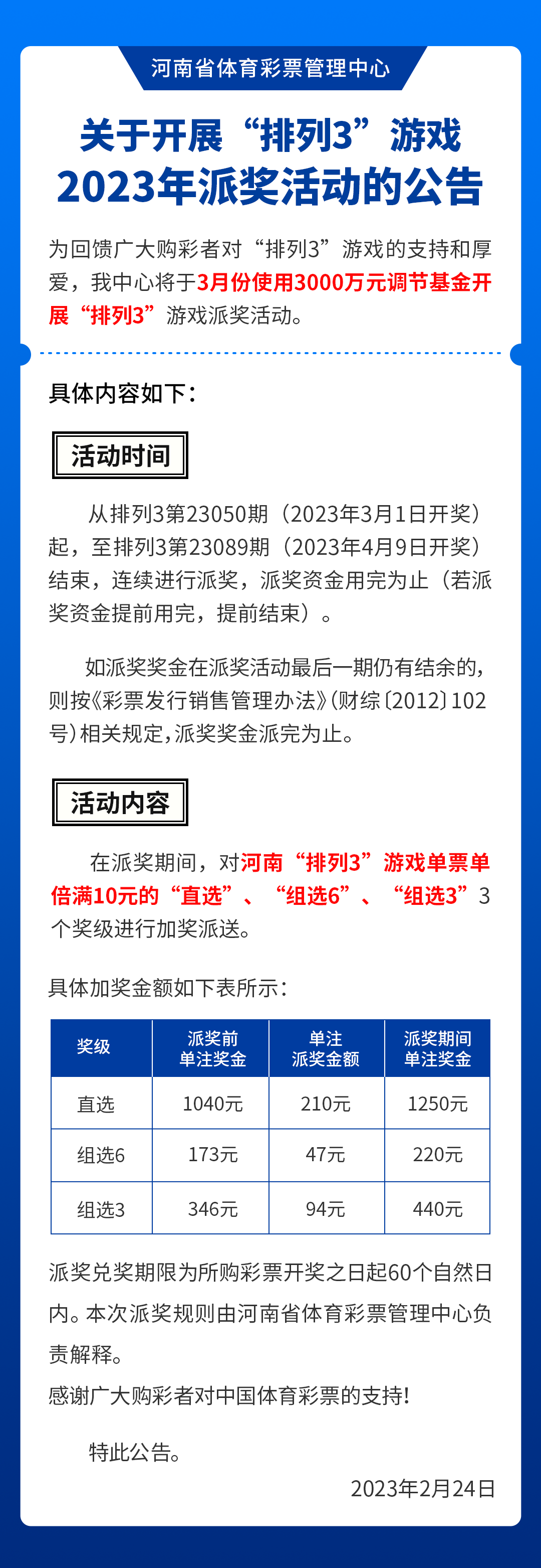 “排列3”游戲2023年派獎(jiǎng)活動(dòng)公告