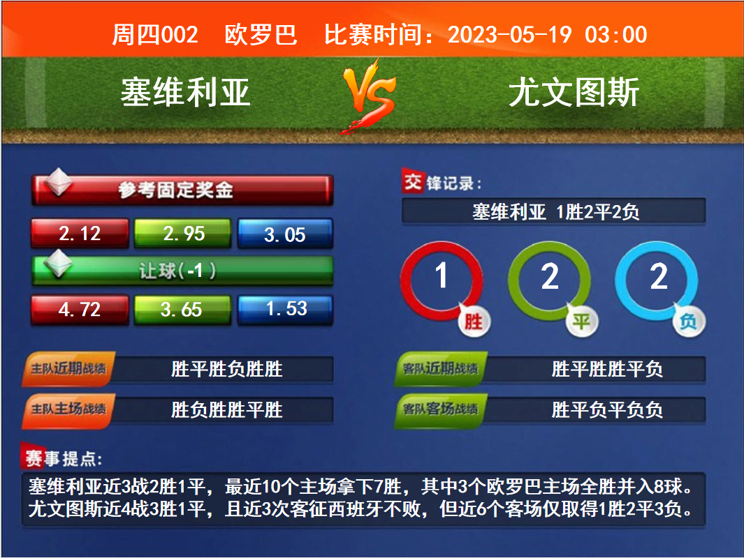 比賽時間:2023-05-19 03:00賽事提點:塞維利亞近3戰(zhàn)2勝1平,最近10個主場拿下7勝,其中3個歐羅巴主場全勝并入8球。尤文圖斯近4戰(zhàn)3勝1平,且近3次客征西班牙不敗,但近6個客場僅取得1勝2平3負。