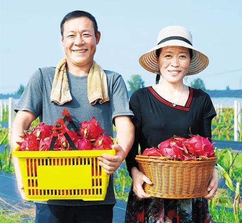 盛夏時節(jié),萬木蔥蘢。在太康縣清集鎮(zhèn)夢里田園火龍果種植基地,一株株仙人掌狀的火龍果成行排列,一個個飽滿的火龍果如火焰般垂掛枝頭。打扮利落的劉秀英邊用手機拍攝火龍果果皮上黃綠相間的鱗狀花萼,邊向粉絲介紹火龍果的長勢和收成情況。